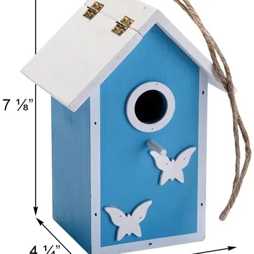 Butterfly Skies Bird House, Blue, GN-BSBB. Wooden bird house with blue body and white trim. 1" diameter entry allows small birds to use the shelter. Hinged roof for nest checks, and attached rope for hanging.