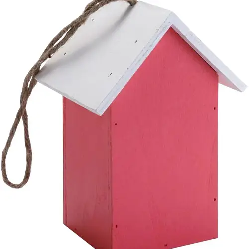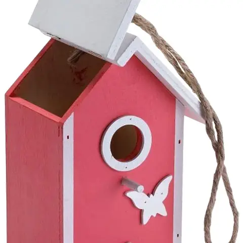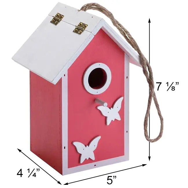 Cotton Candy Bird House with Butterflies. Adorable wooden bird house with pink body and white trim. Butterfly shaped accents add a fun look. Hinged roof opens for nest checks. May be hung.